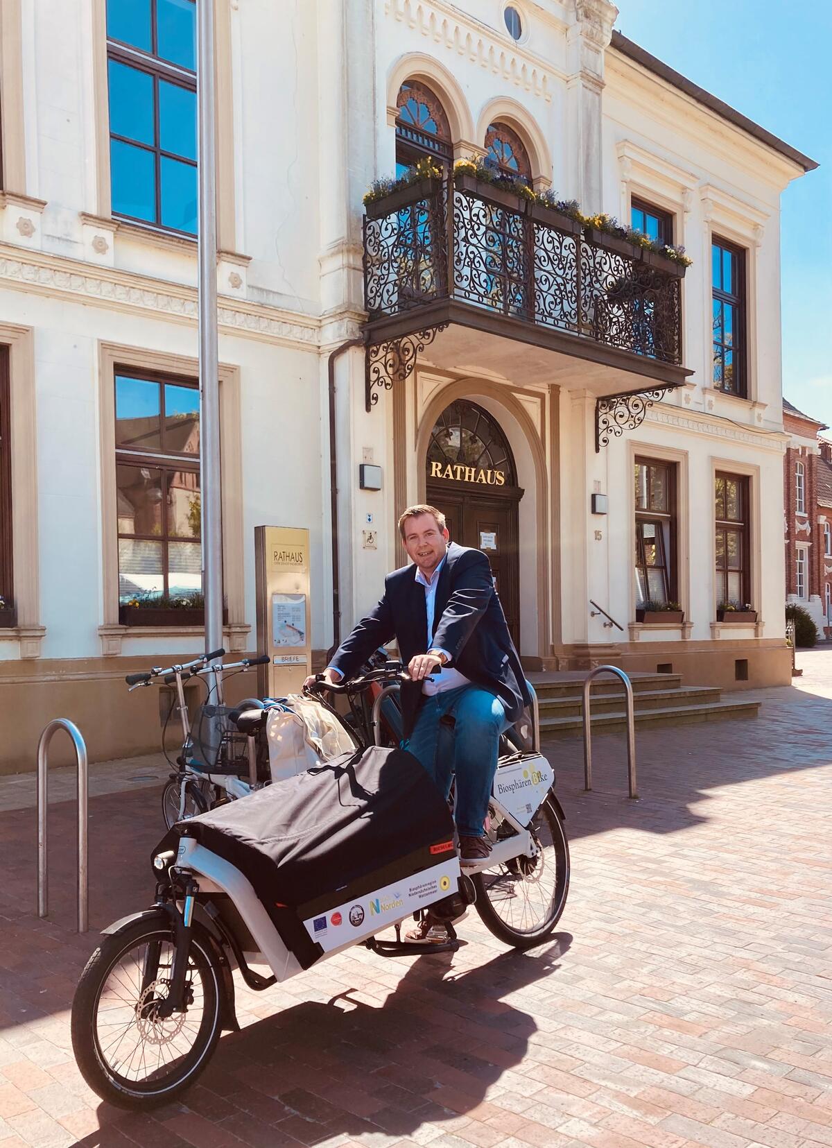 Florian Eiben, Bürgermeister der Stadt Norden, und Erwin Sell, Bürgermeister der Samtgemeinde Hage, nahmen die Räder am Montag (09.05.) entgegen. „Das Biosphären-Bike passt hervorragend zur Mobilitätsstrategie der Stadt Norden, indem das Fahrrad als Verkehrsmittel für innerörtliche Ziele gefördert und so als positiver Beitrag zum Umweltschutz des eigenen Lebensraums beworben wird“, erklärte Bürgermeister Eiben. In Norden wird „Otto“ (benannt nach dem Naturkundler Otto Leege) bei der Stadtbibliothek zur Ausleihe bereitstehen, „Helene“ in Hage bei der Paddel- und Pedalstation, die von den Pflege- und Betreuungszentren Helenenstift und Johann-Christian-Reil-Haus betrieben wird. „Als naturnahes, umweltschonendes Fortbewegungsmittel ist das Biosphären-Bike eine ideale Ergänzung des bestehenden Angebots der Paddel- und Pedalstation und für Einheimische ebenso wie für Touristen attraktiv“, ergänzte Bürgermeister Sell.