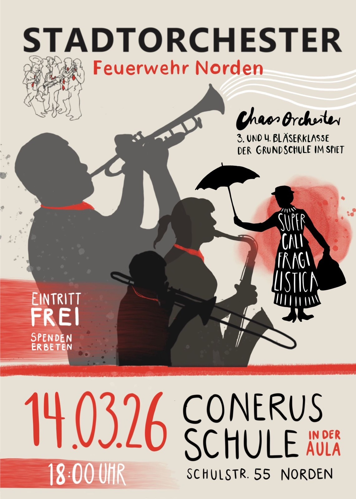 Am kommenden Wochenende findet das Konzert der Chaos Orchesters und der 3. und 4. Bläserklasse der Grundschule im Spiet in der Aula der Conerus Schule statt.
